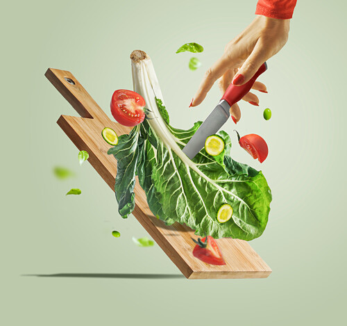 Caption:Women hand with knife , flying salad ingredients and cutting board at light green background. Creative food levitation. Healthy eating and dieting